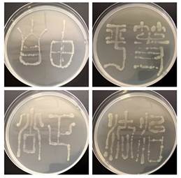 (平板作画一等奖作品——大肠杆菌书法家:作者以大肠杆菌为画笔,在牛肉膏蛋白胨培养基上用小篆书写了社会主义核心价值观“自由”“平等”“公正”“法治”)