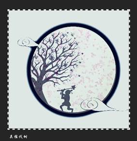 (培养皿艺术创作一等奖作品——吴桂伐树:作者将之前显微镜拍摄的细菌染色图片视为吴桂伐树时树木震动落下的花瓣,添加了树木和人物后呈现出一幅完整的作品)